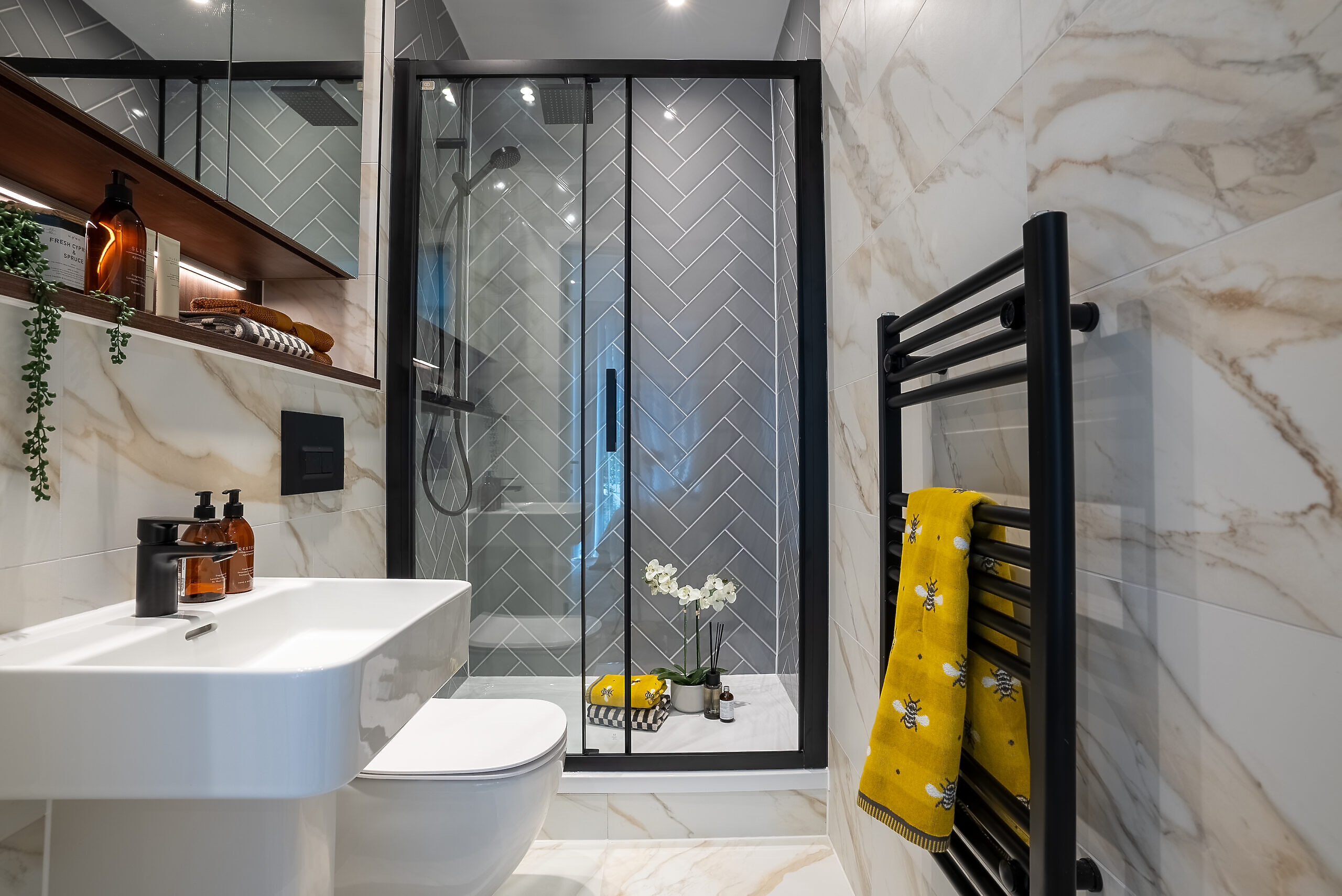 - Black ladder towel rail to bathrooms and en-suites