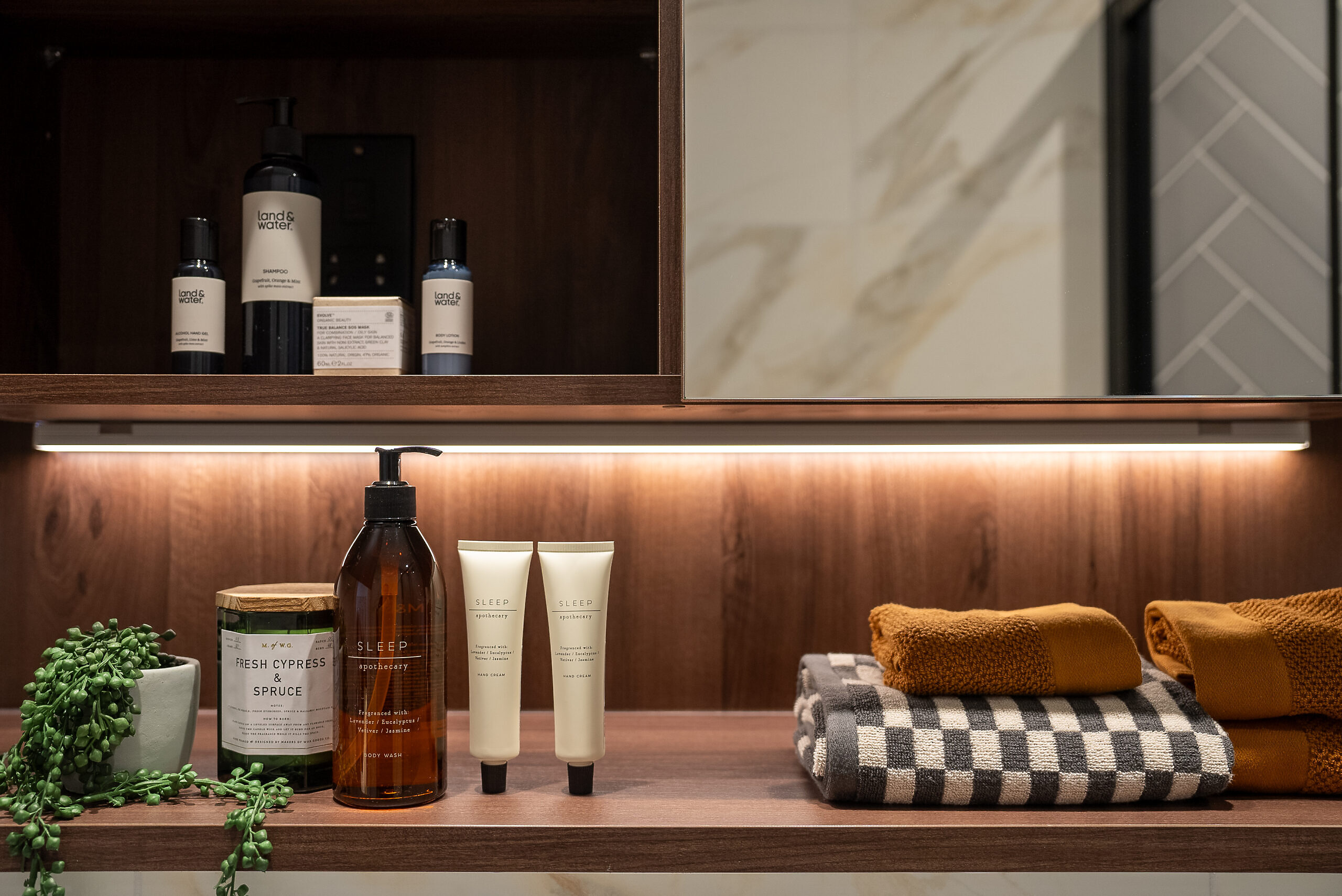 - Bespoke storage with mirrored doors and shelving, with built-in shaver socket and lighting