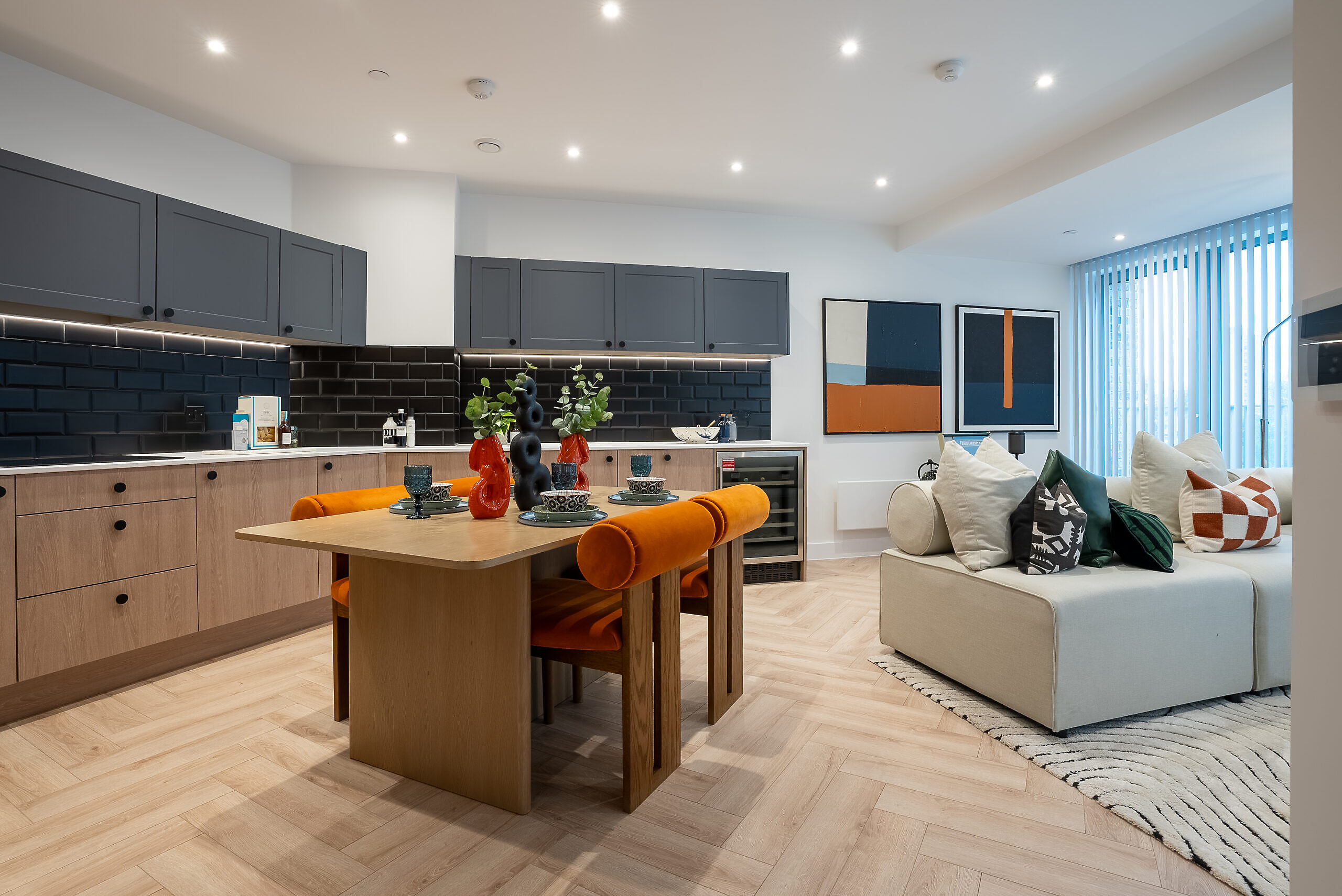 - Herringbone laminate wood flooring in kitchen, living area and hallway