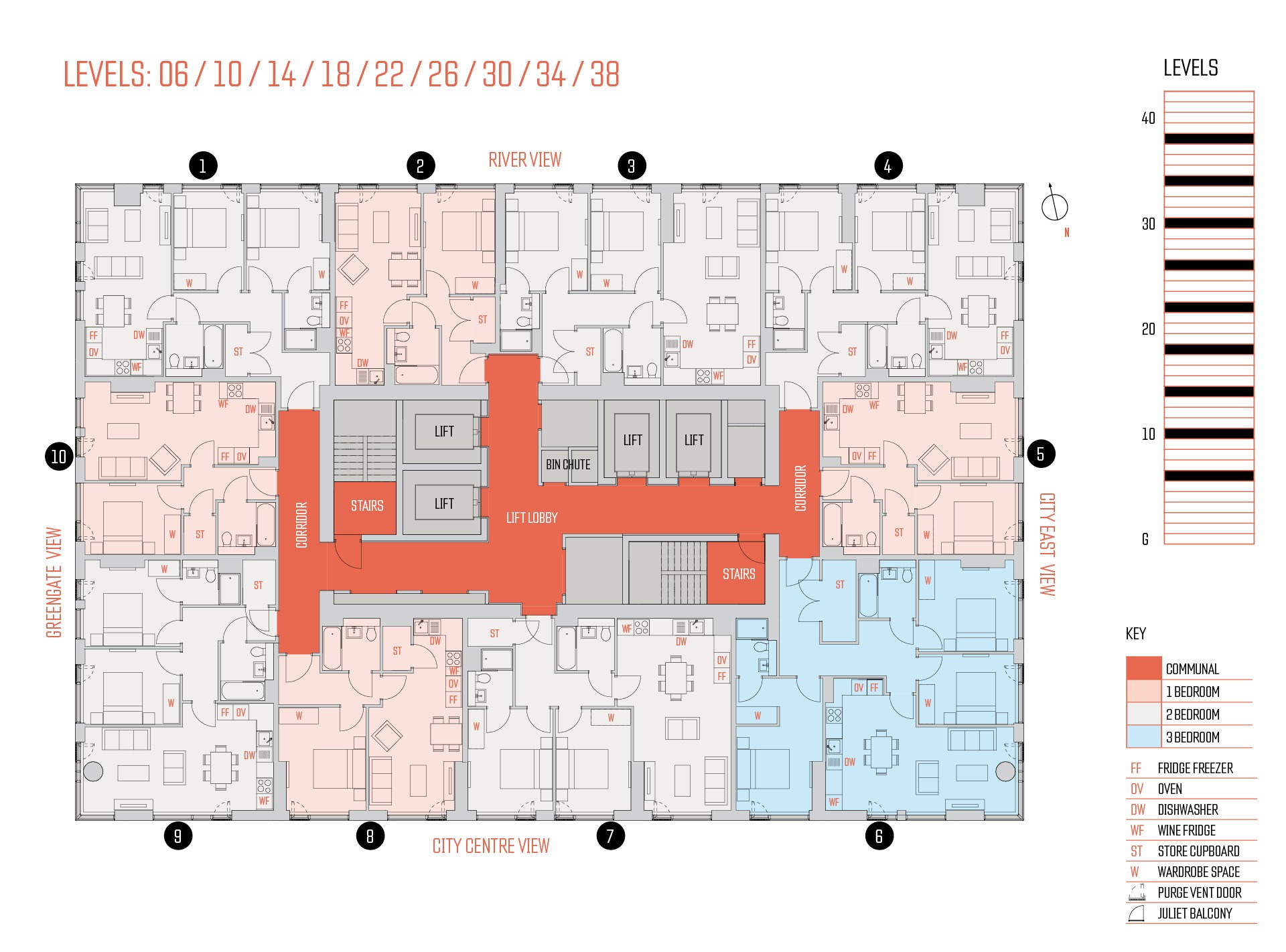- 3 tower lifts provide access from ground level up to and including level 42.