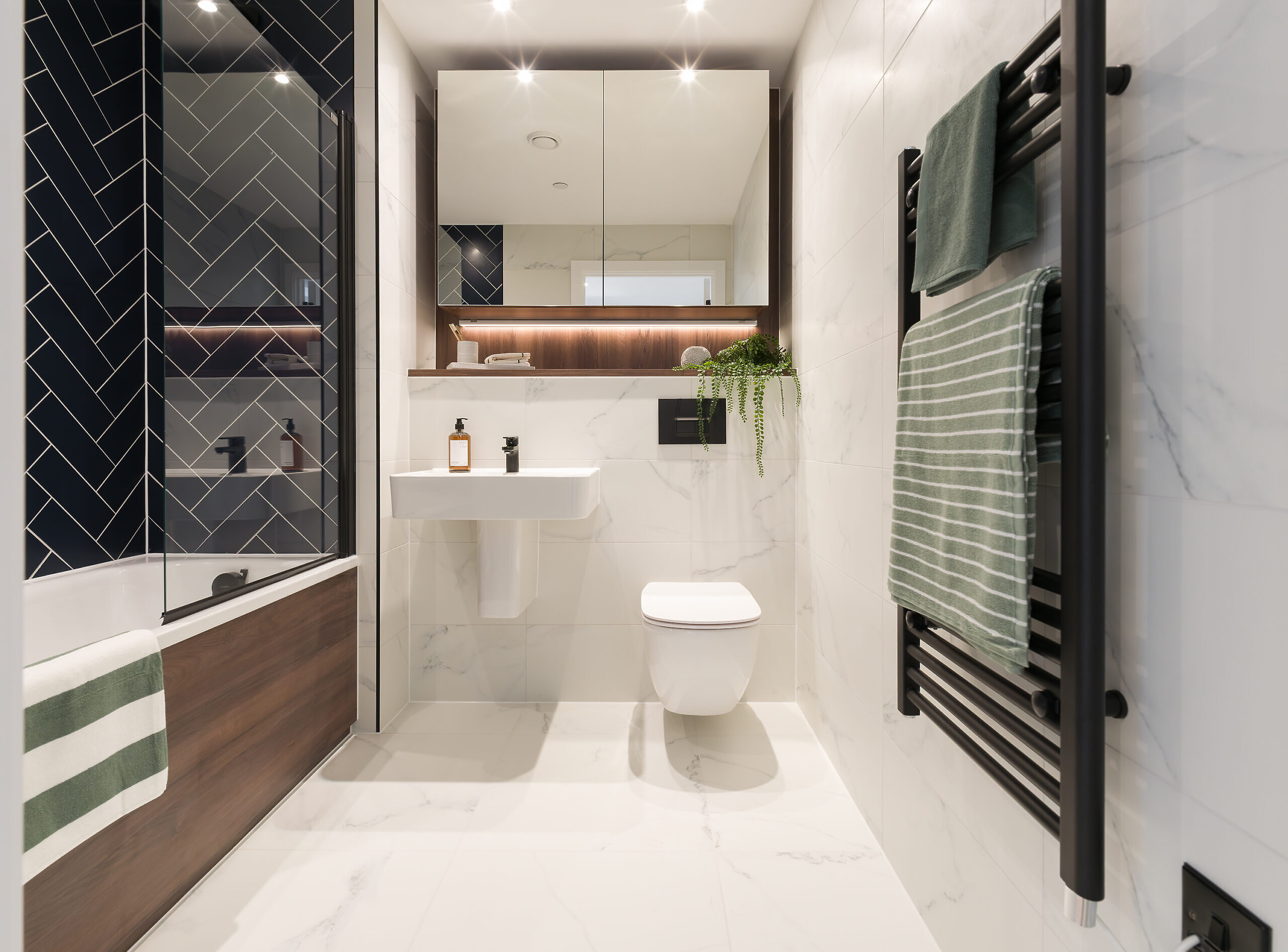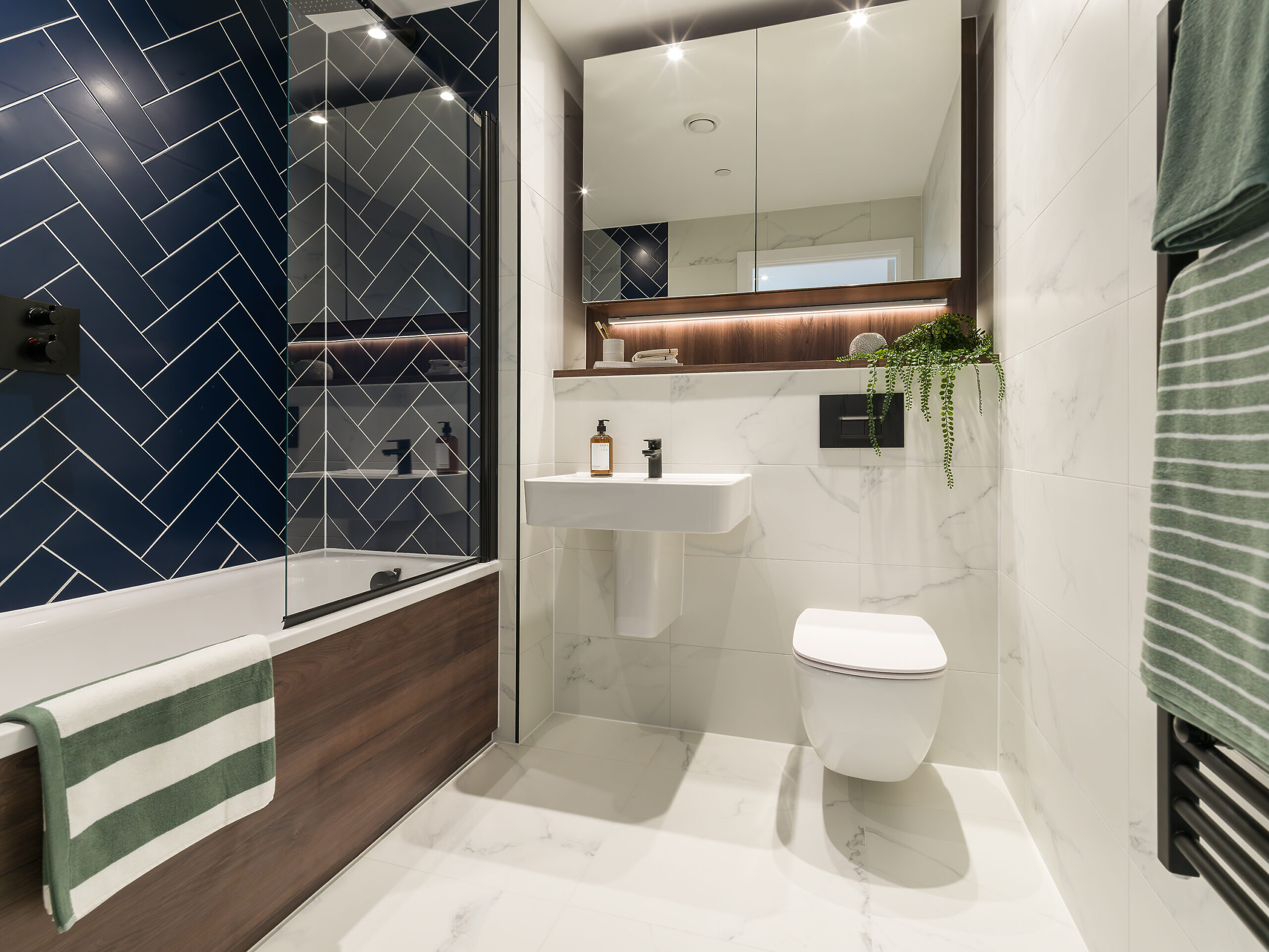- Fully tiled bathroom with feature navy metro tile to bath area