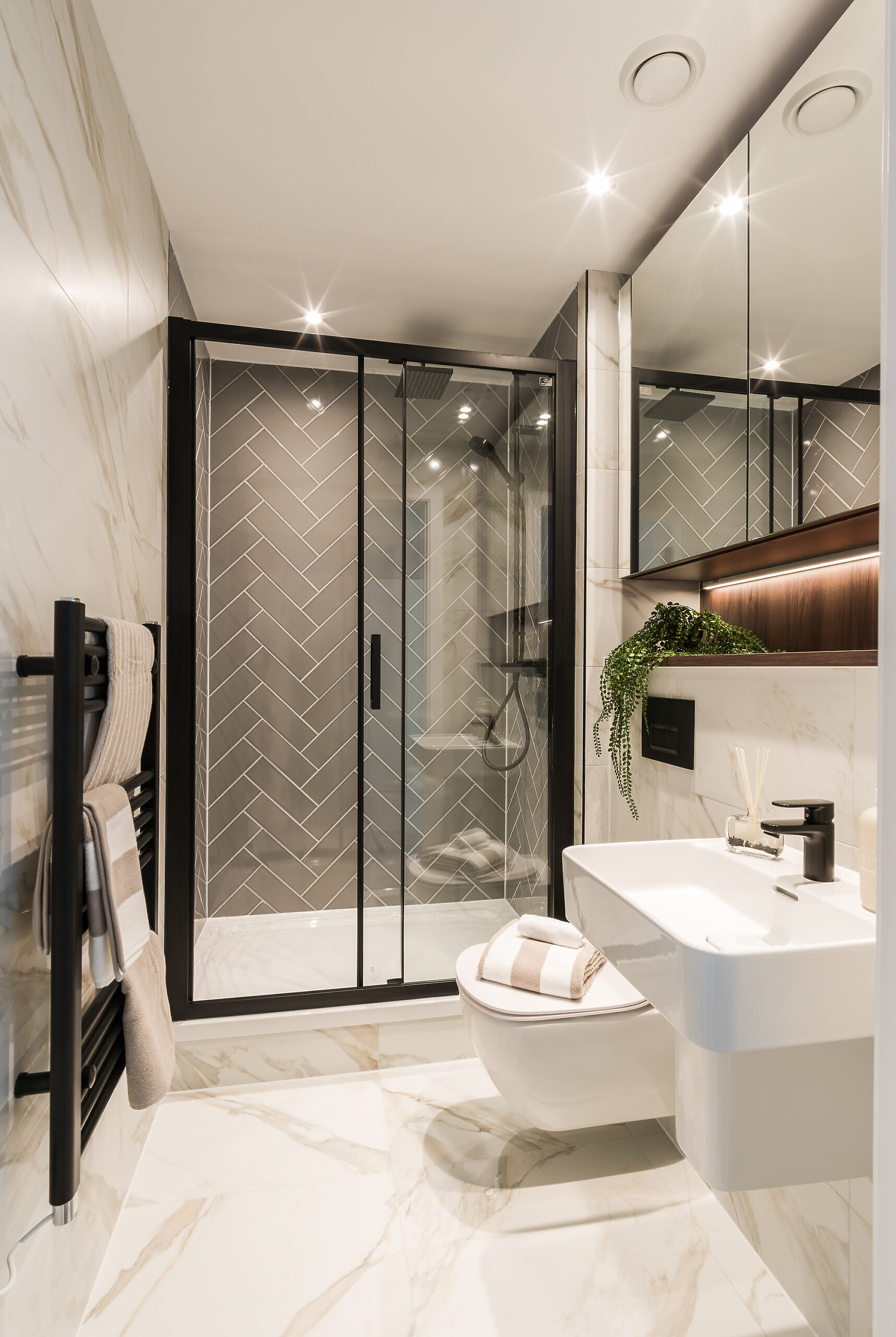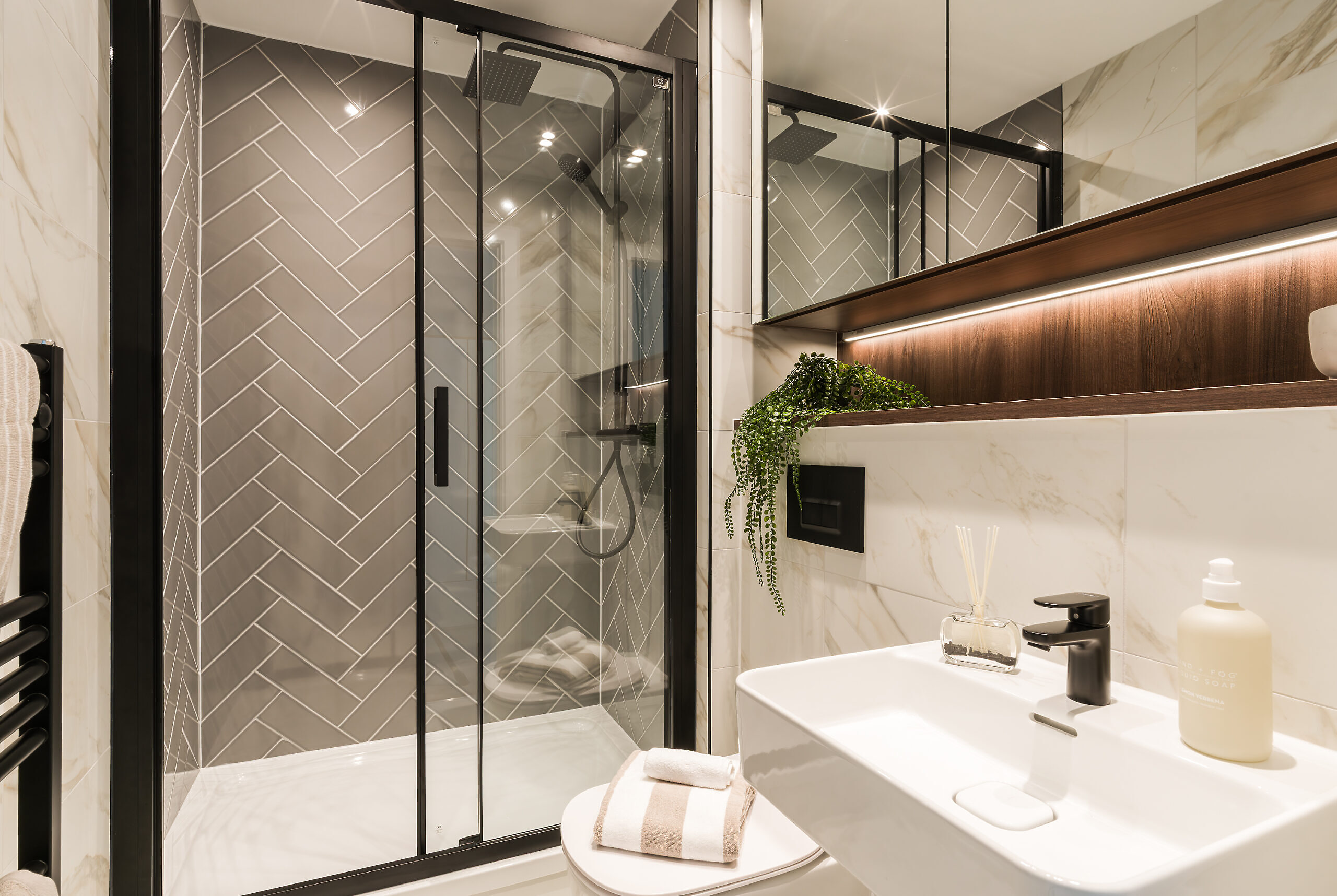 - Bespoke storage with mirrored doors and shelving, with built-in shaver socket and lighting