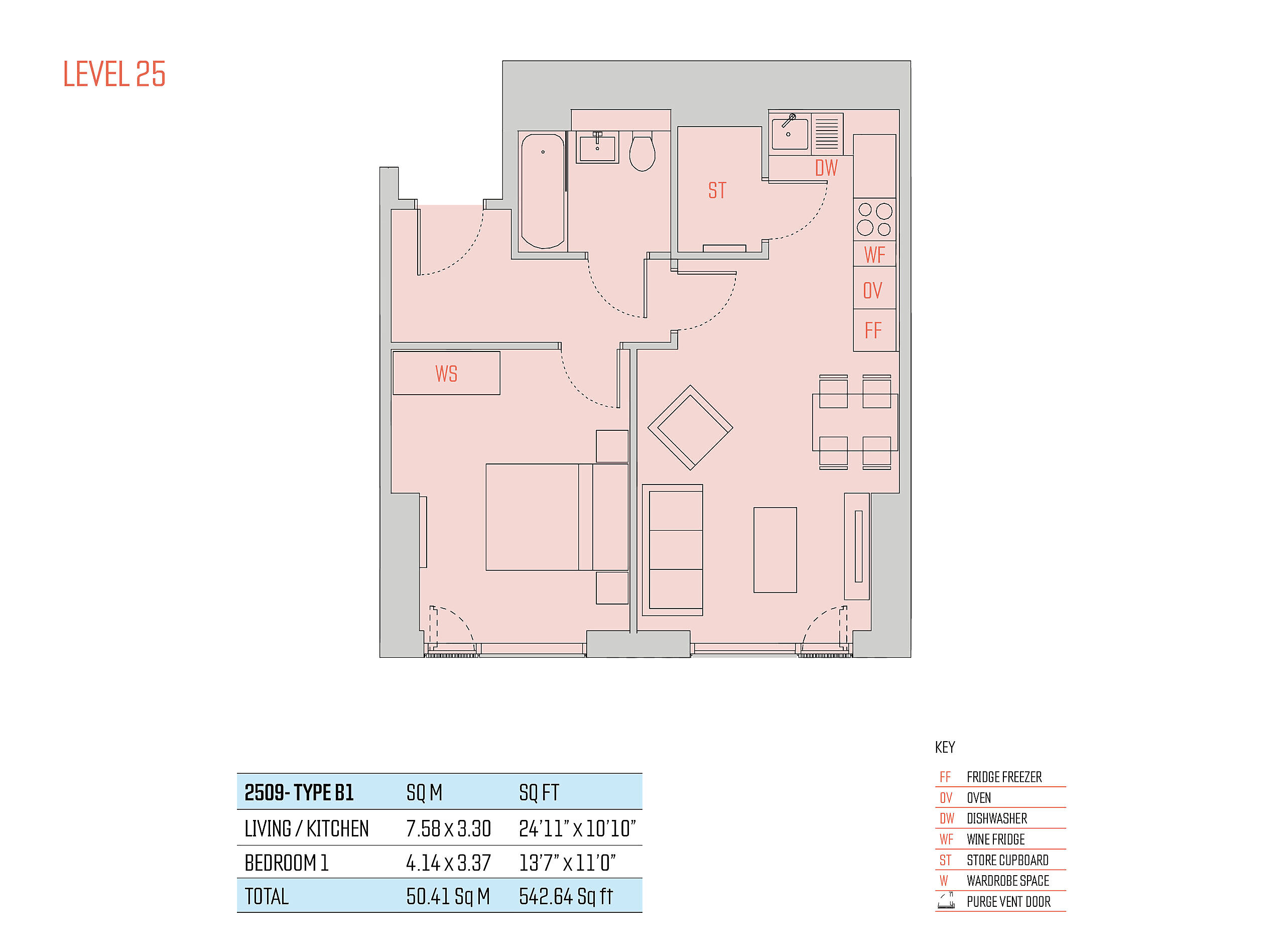 Show apartment photography is of a 1-Bedroom - Type B2 apartment and is intended for illustrative purposes only. Apartment 2509 DOES NOT feature a terrace and it does not come dressed as standard.