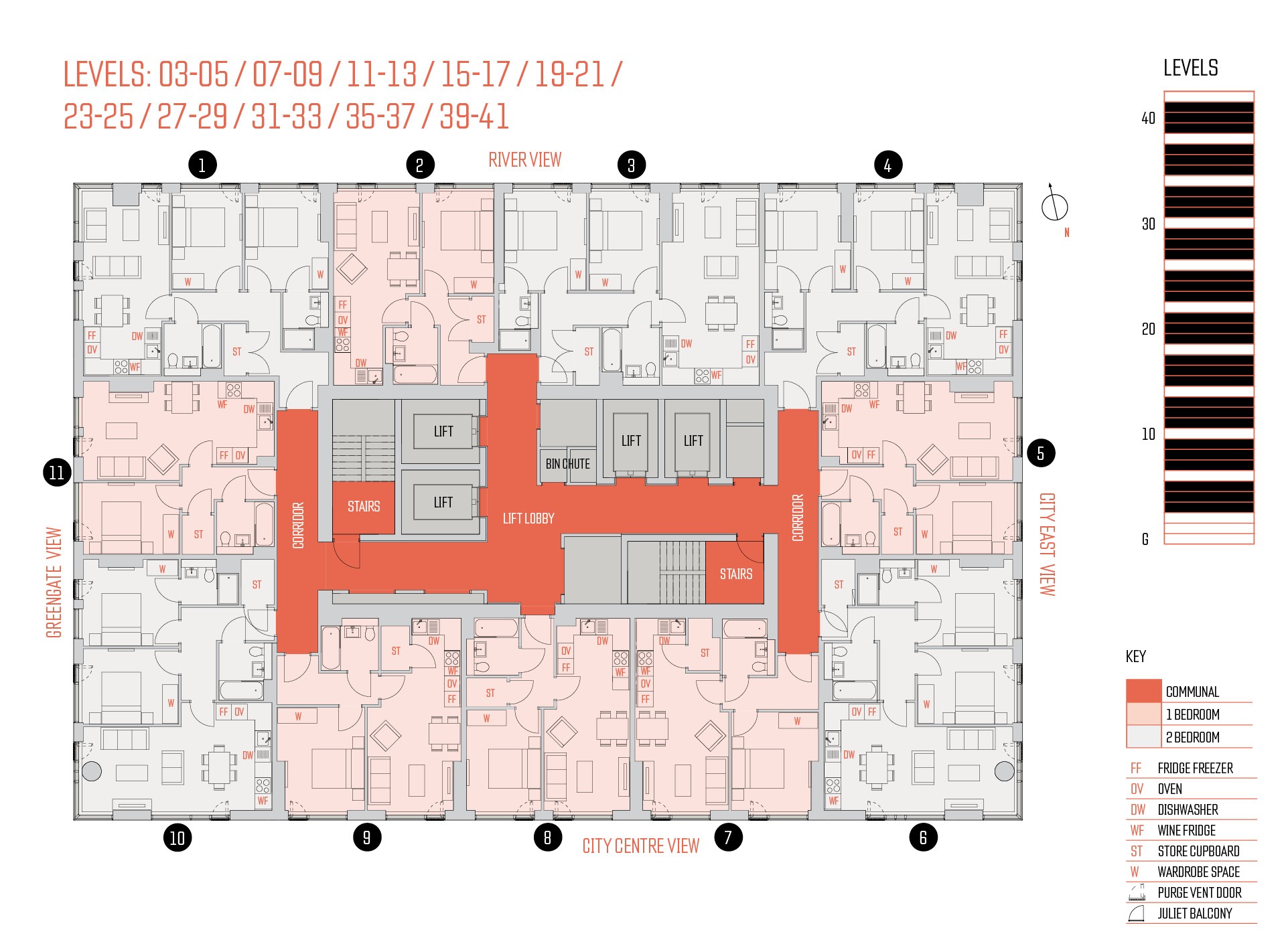 - 3 tower lifts provide access from ground level up to and including level 42.
