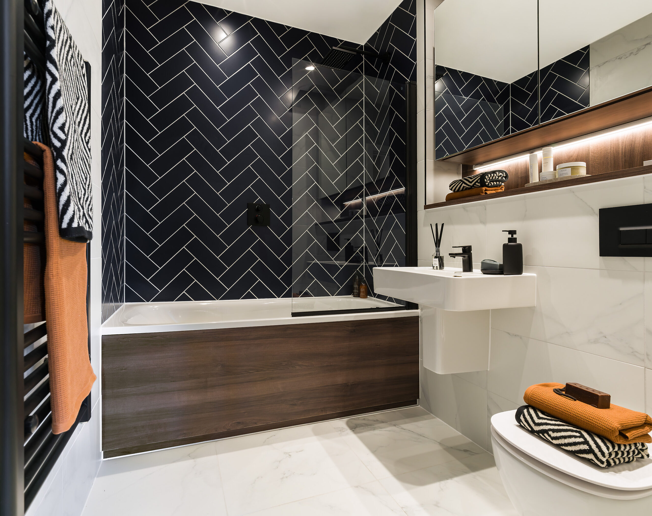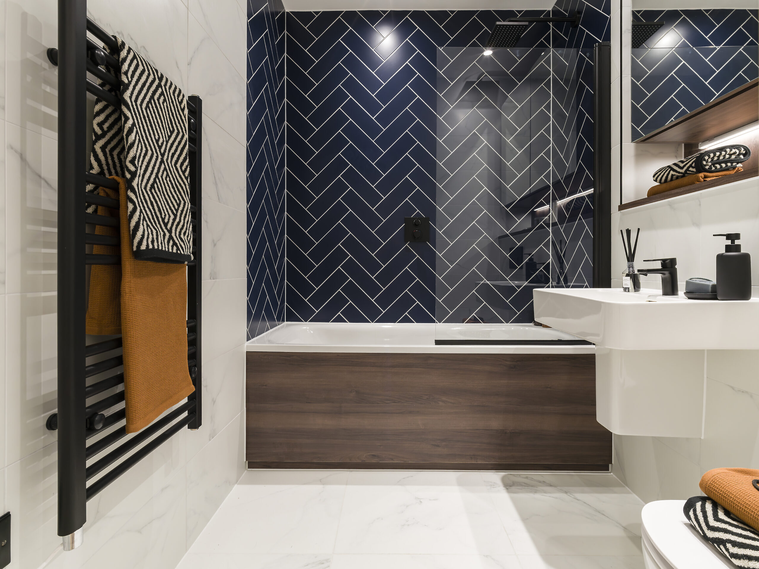 - Fully tiled bathroom with feature navy metro tile to bath area