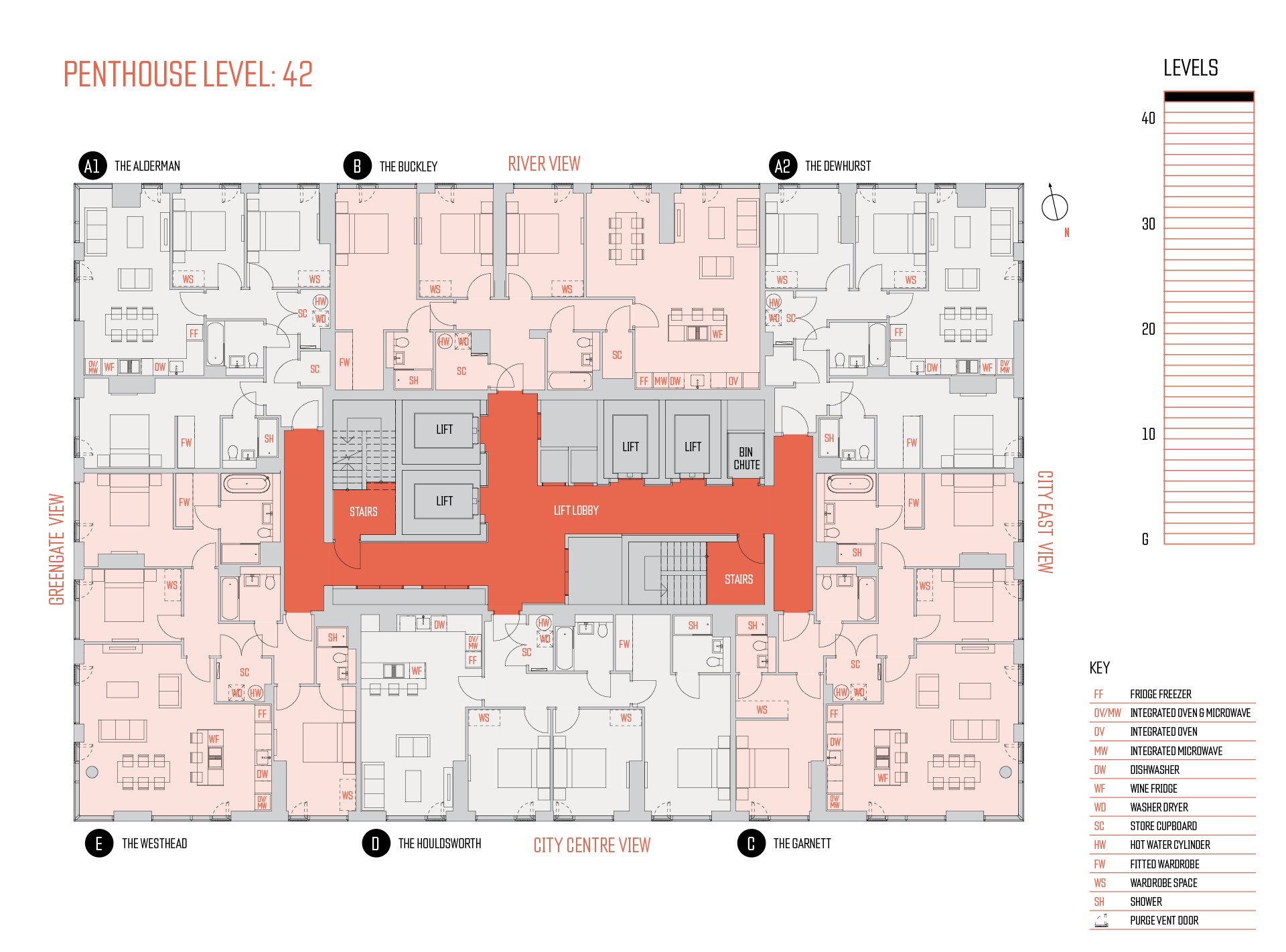 - Fob-only access from lifts and stair core to penthouse floor