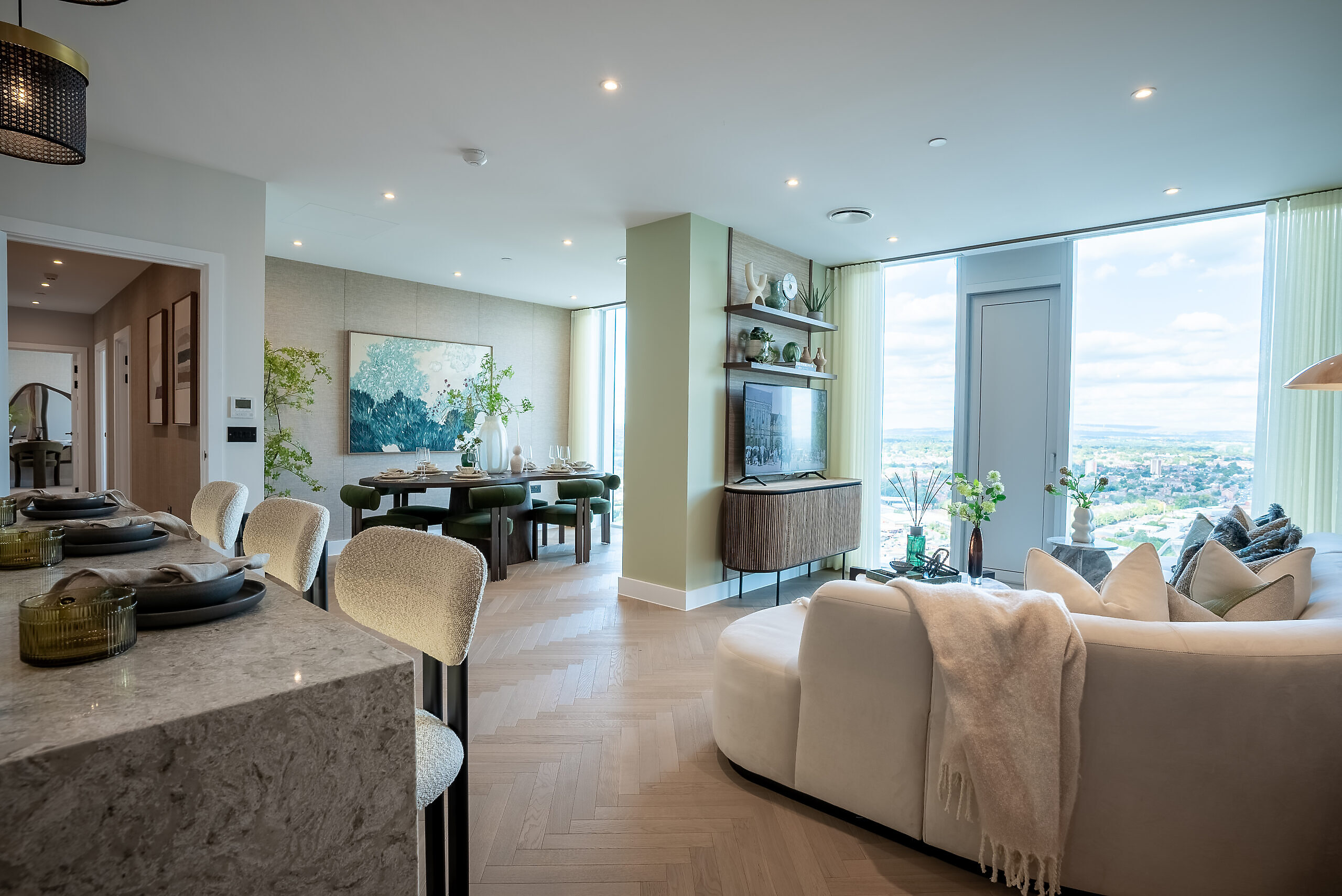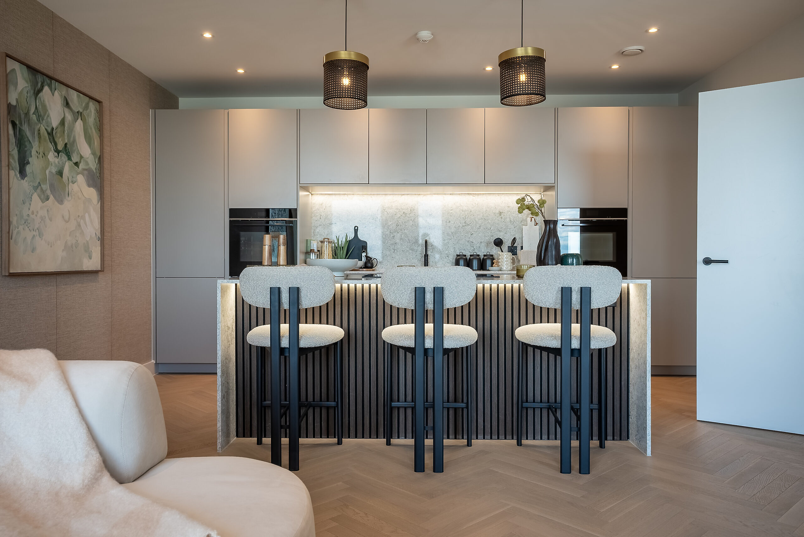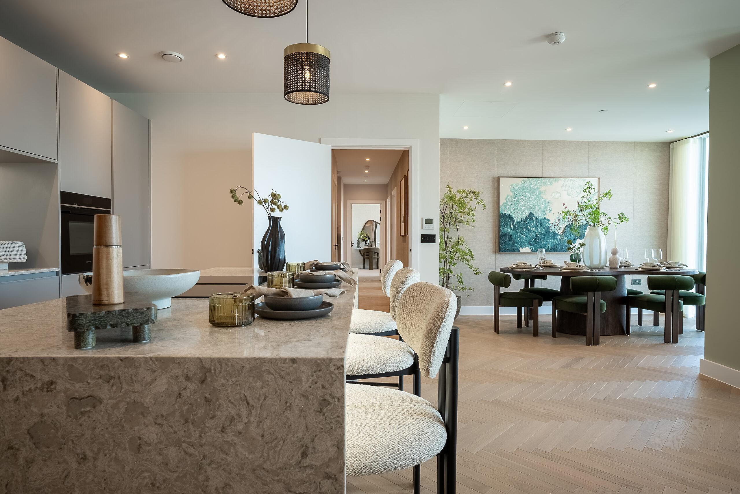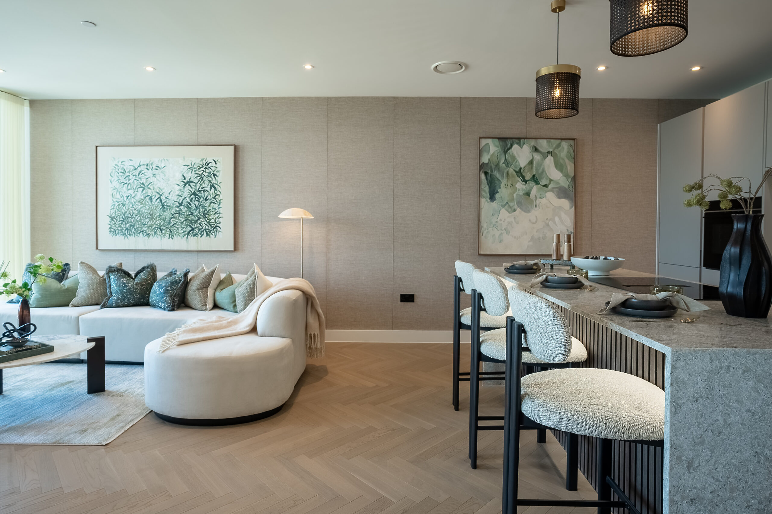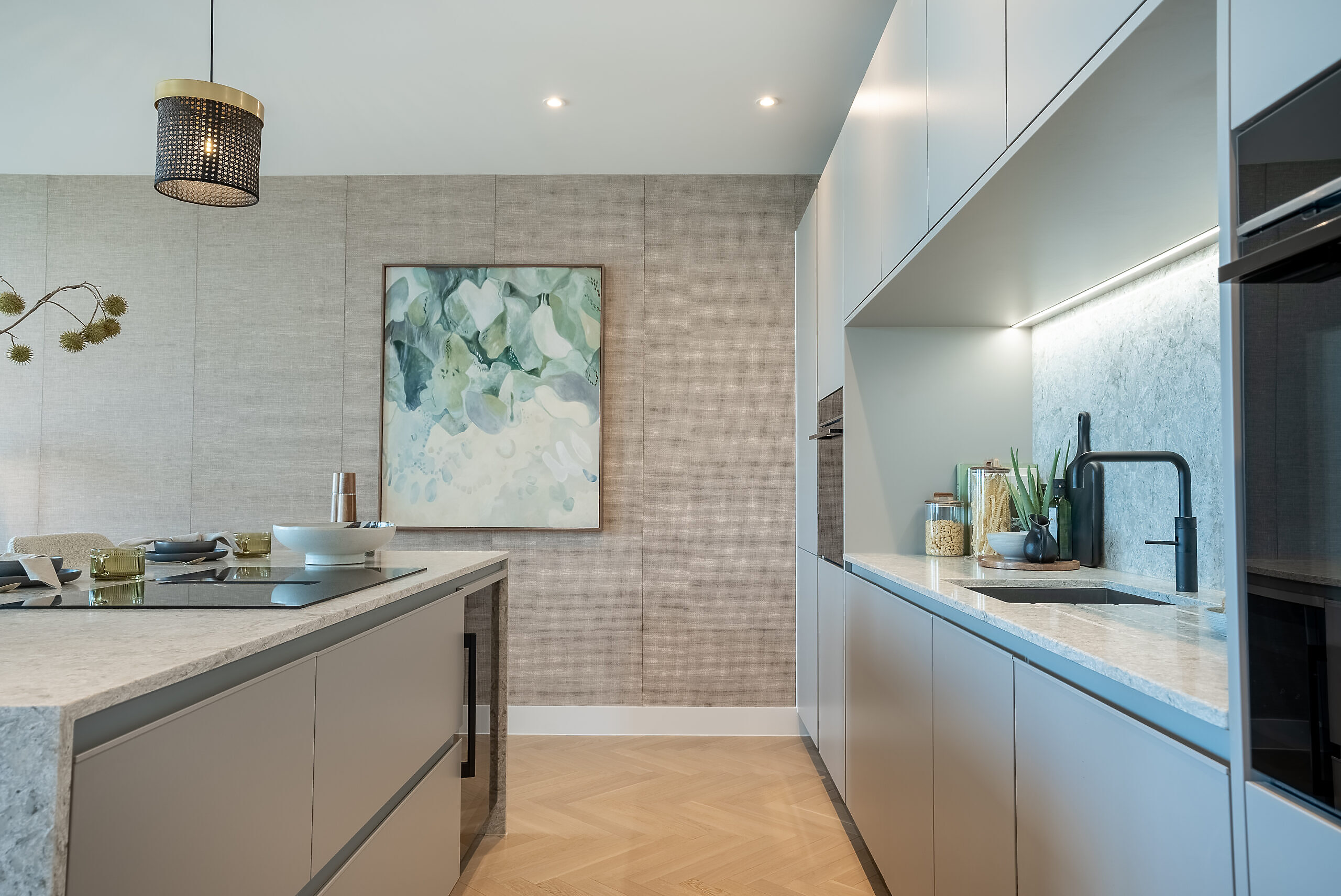 - Herringbone Misty Grey engineered wood flooring in kitchen, living area and hallway