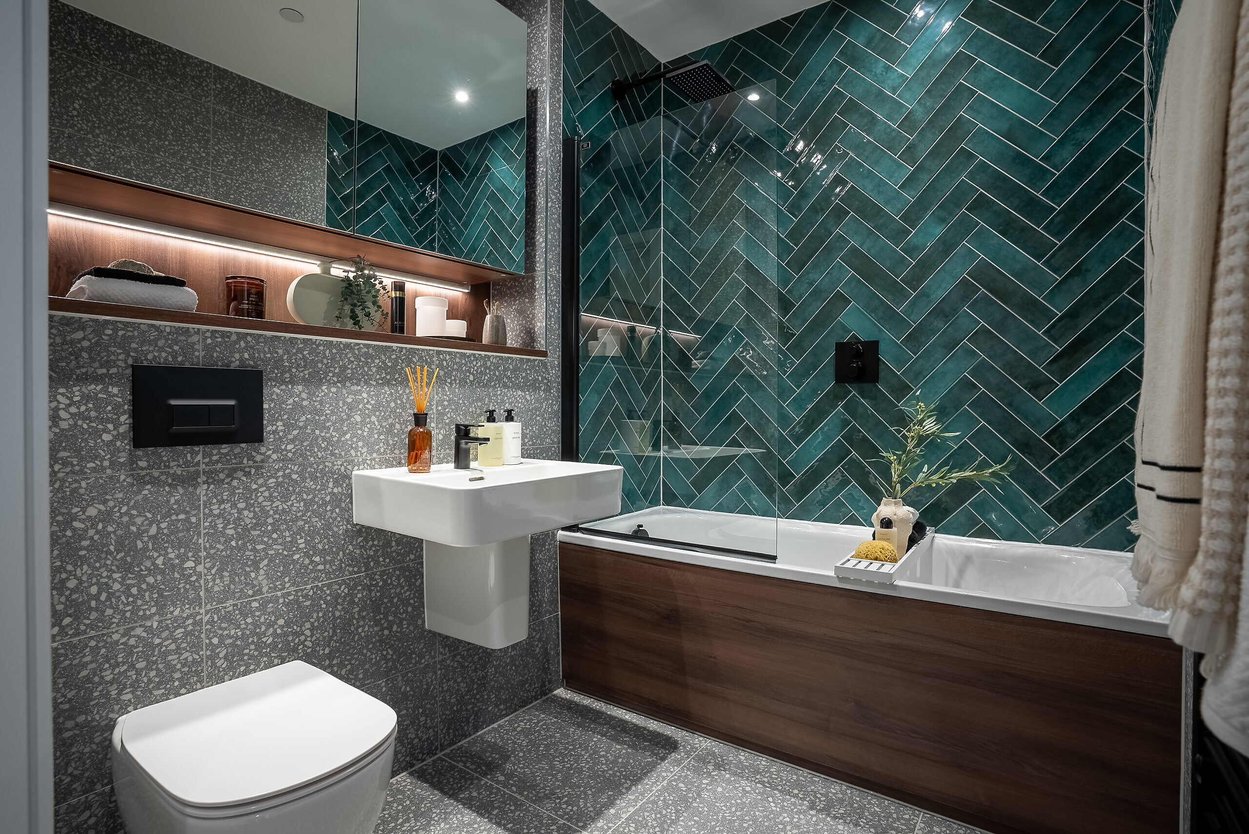 - Floor-to-ceiling fully tiled bathroom with feature tiling to bath area