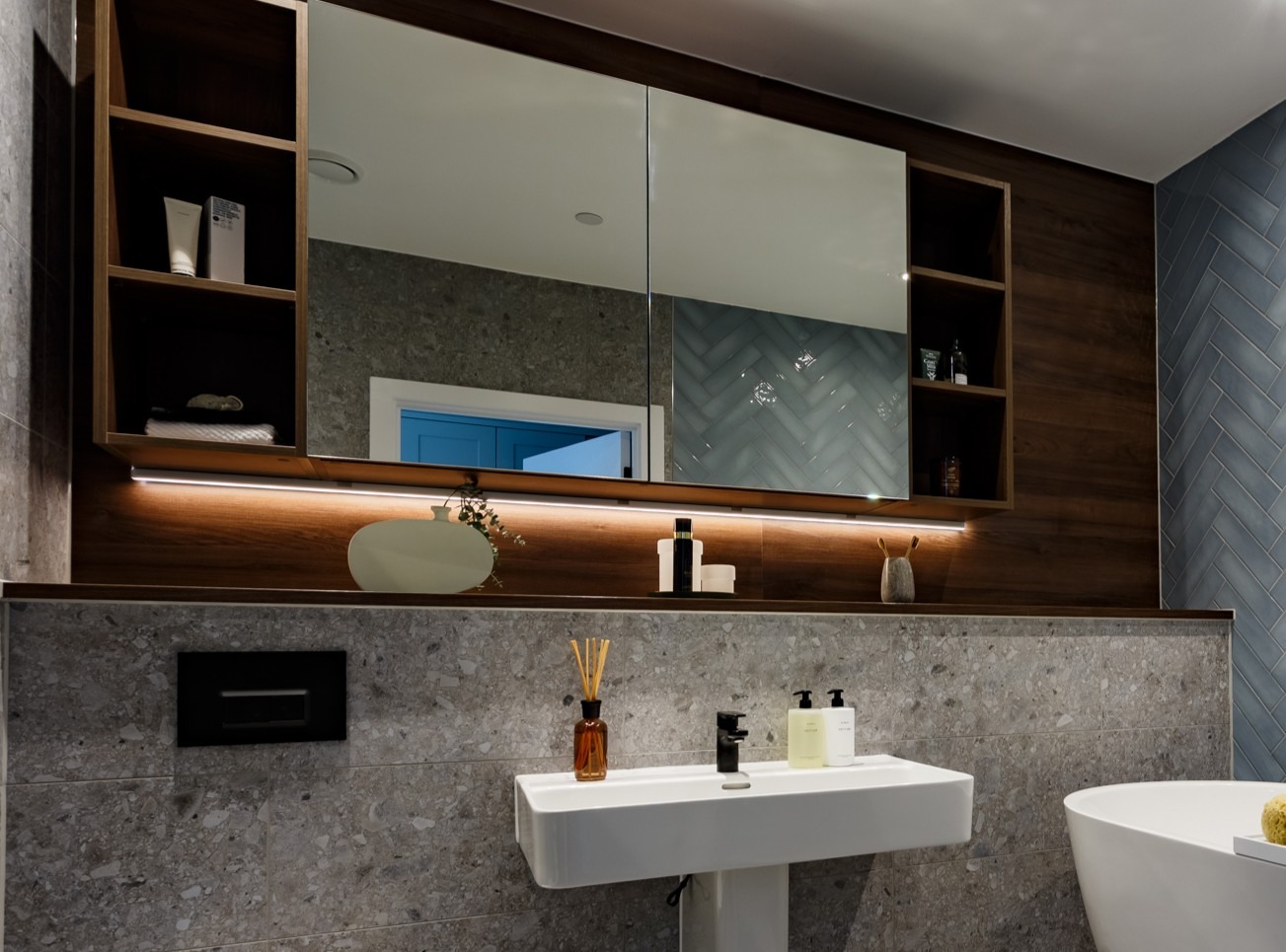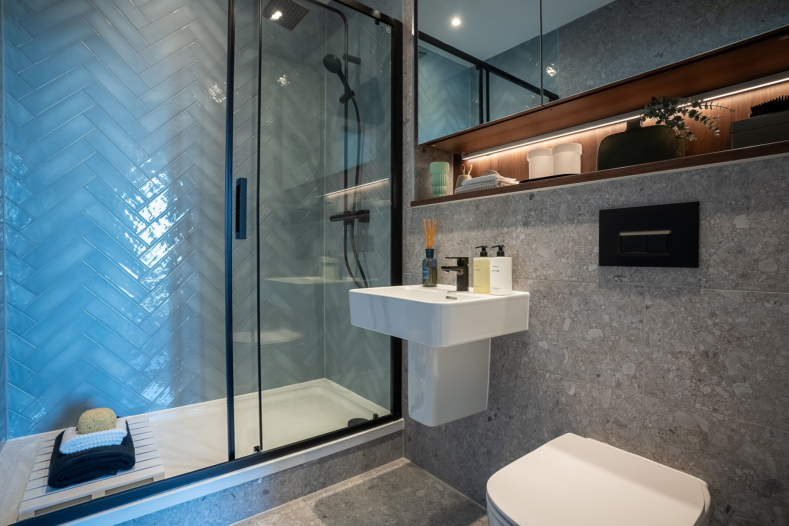 - Bespoke storage with mirrored doors and shelving, with built-in shaver socket and lighting