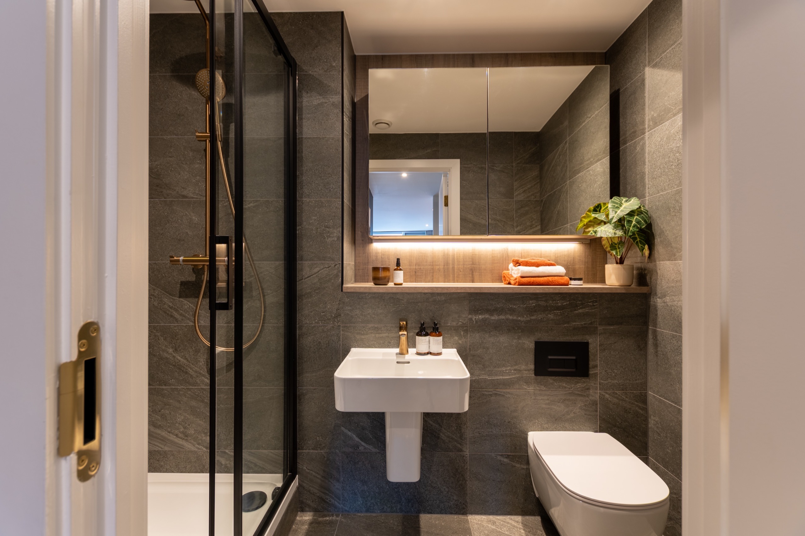 • Bespoke storage with mirrored doors, shelving, lighting and built-in brushed gold shaver socket