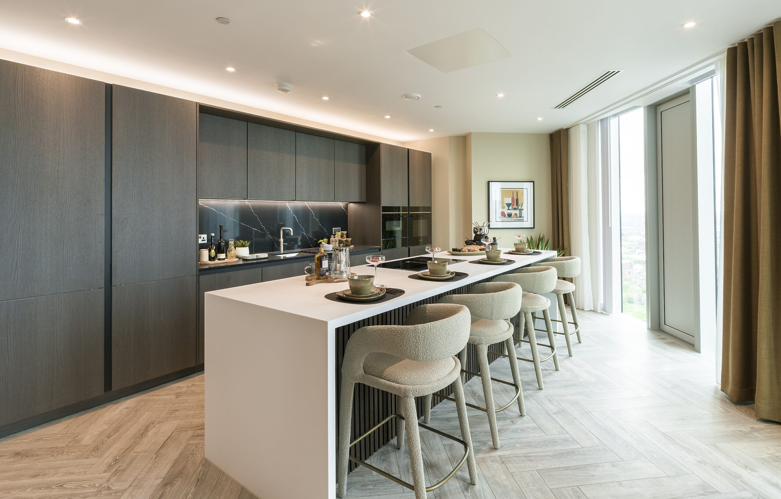 - Bespoke handleless kitchen cabinets with Oolong Oak tall, base and wall units