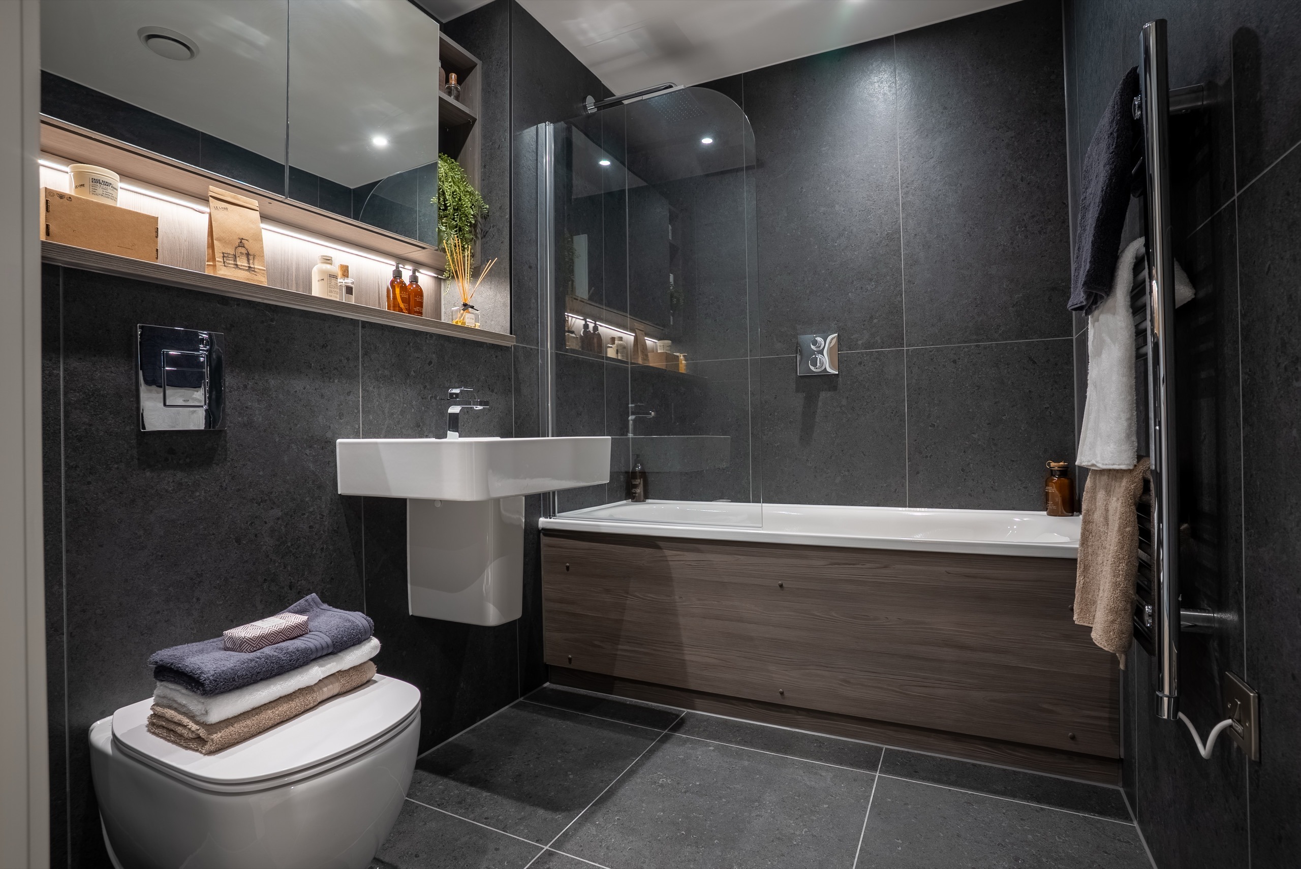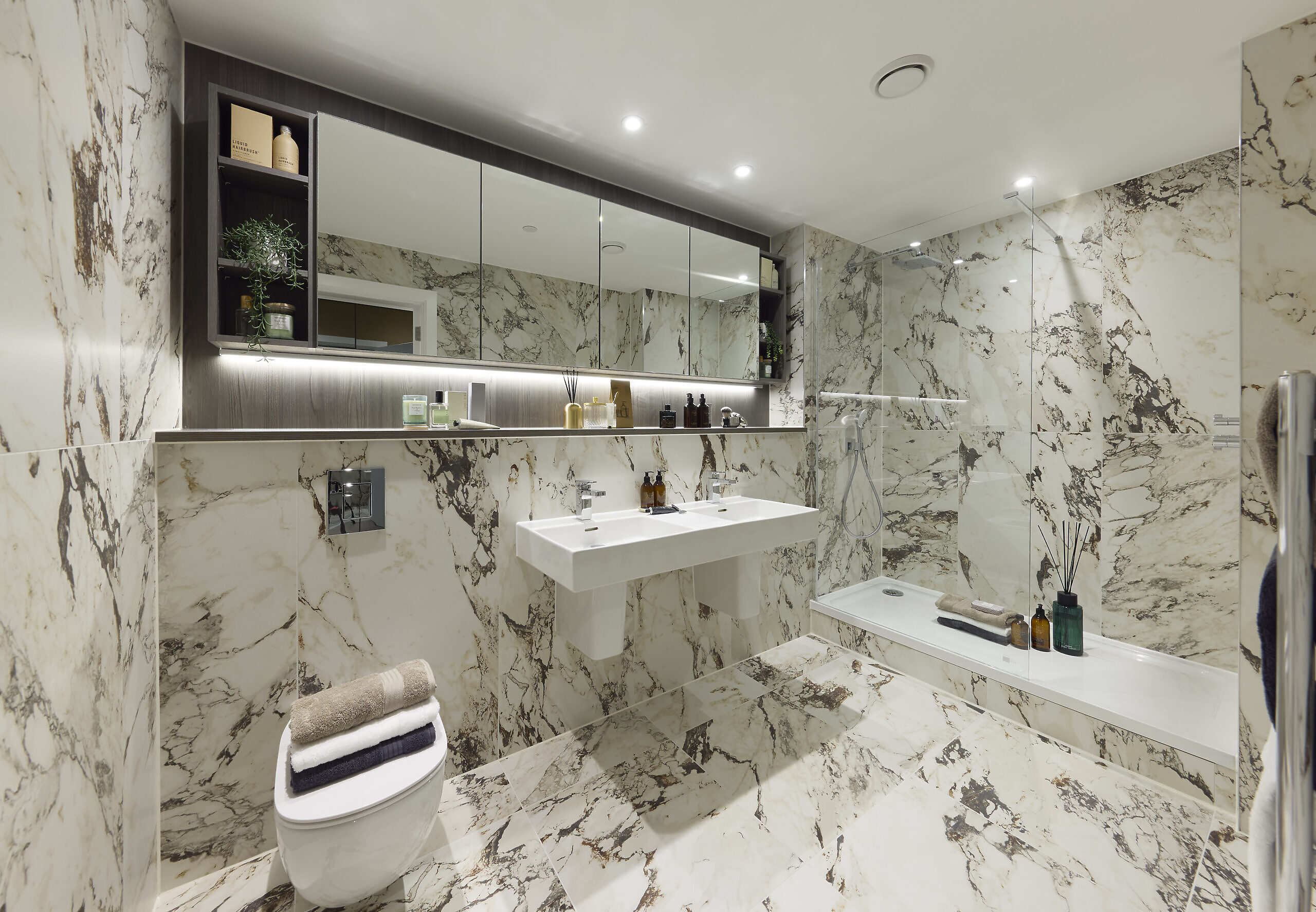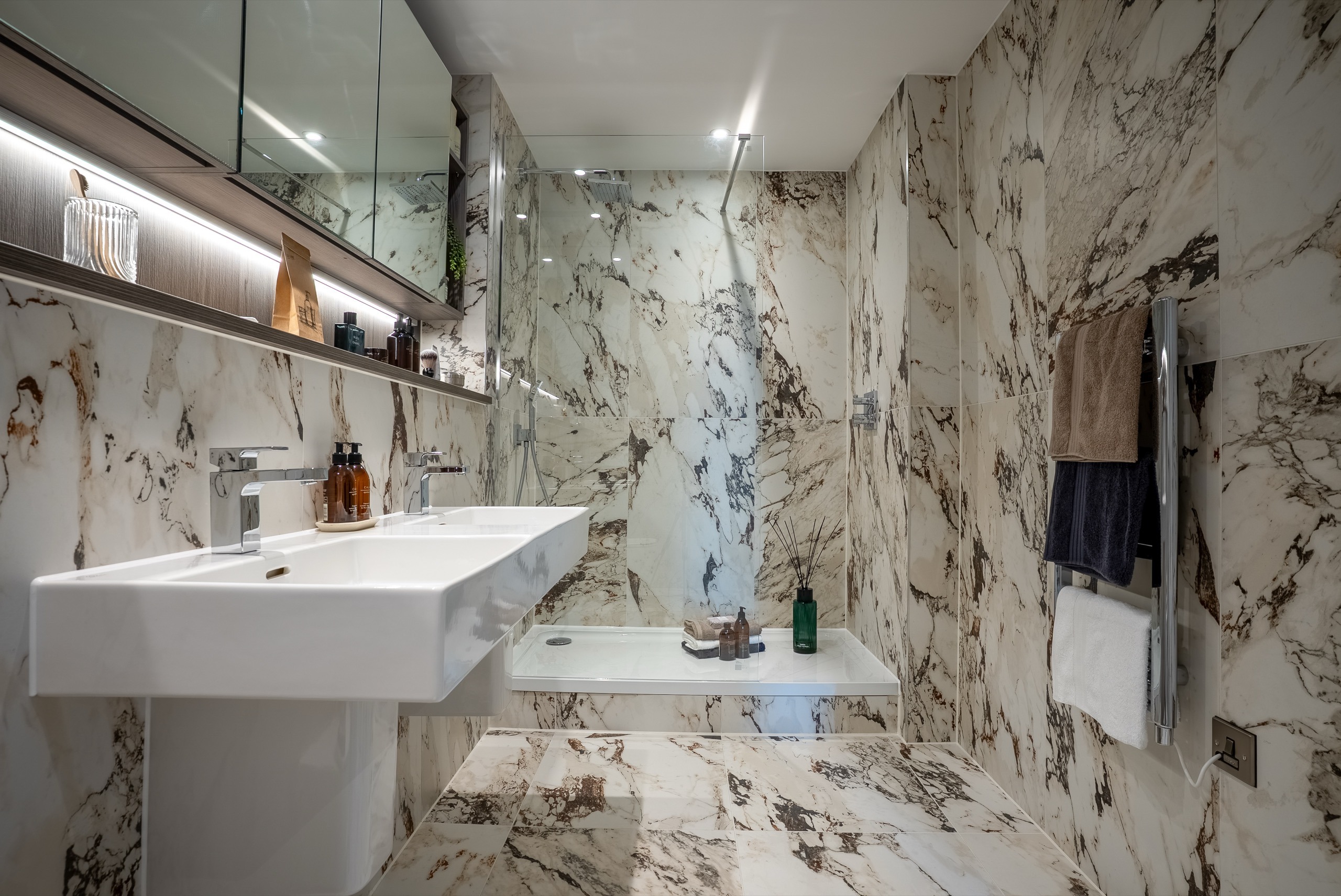 - Bespoke storage with mirrored doors and shelving, with built-in shaver socket and lighting