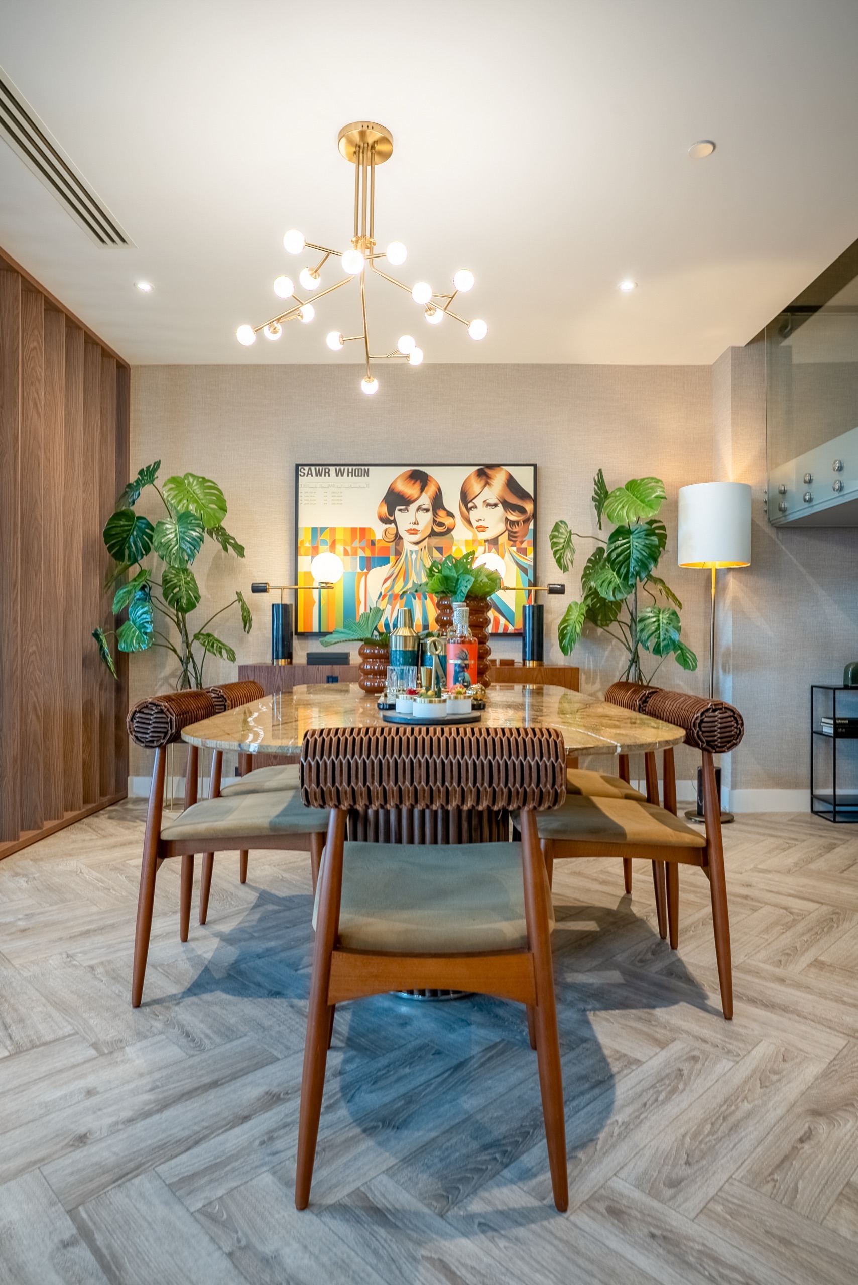 - Herringbone Sardinia Oak laminate wood flooring in kitchen, living area and hallway