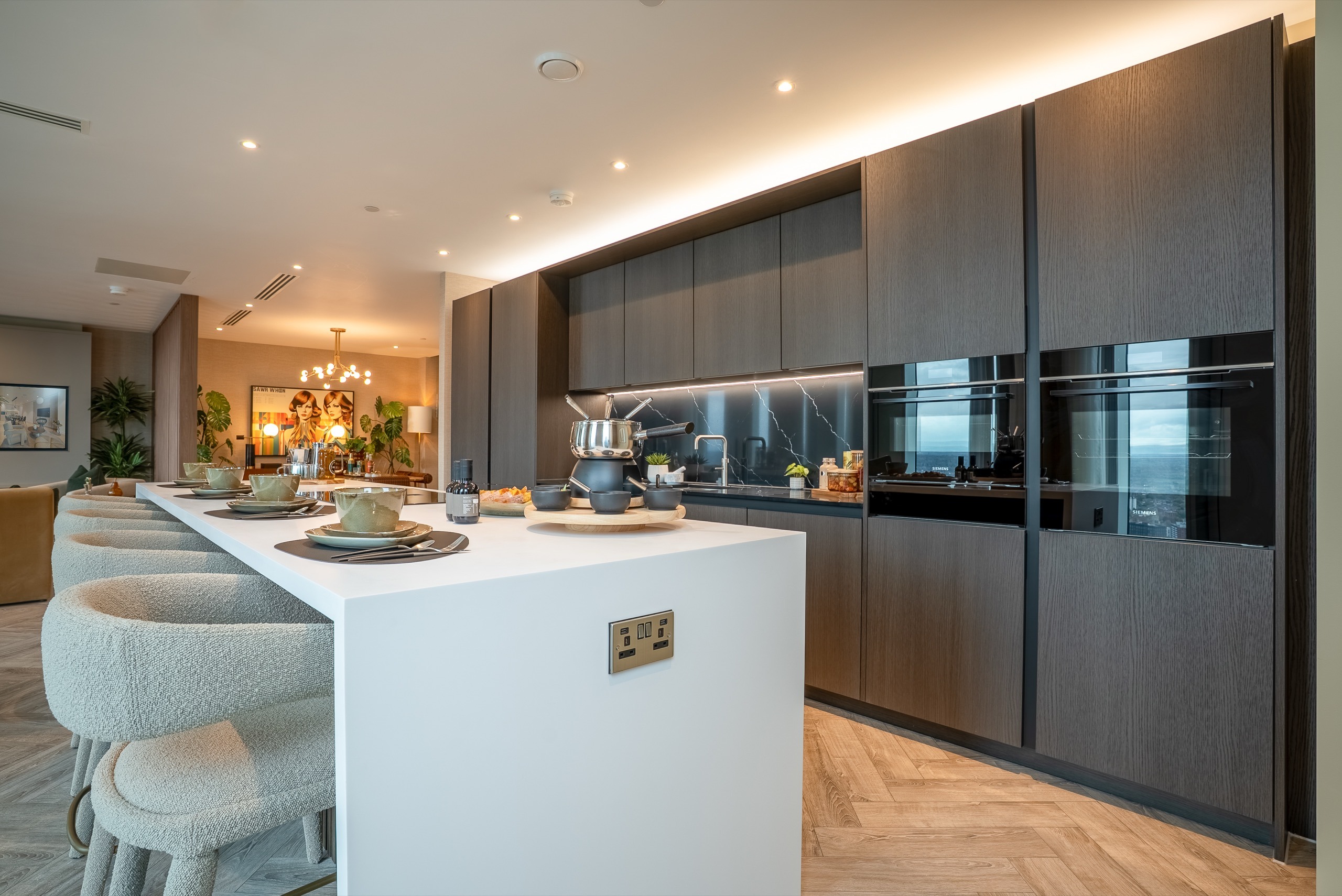 - Integrated Siemens venting induction hob, oven, combination microwave, extractor fan, and warming drawer