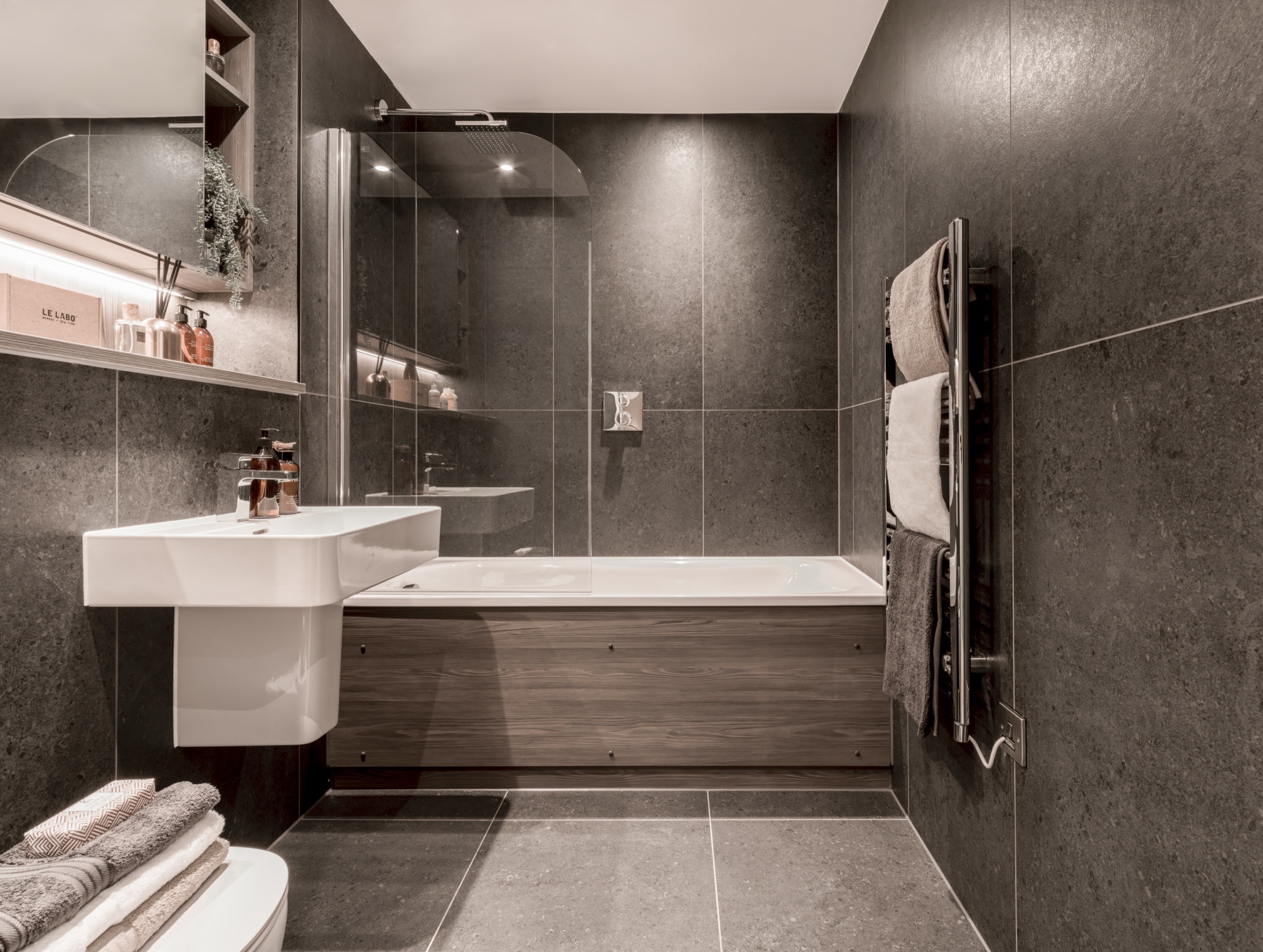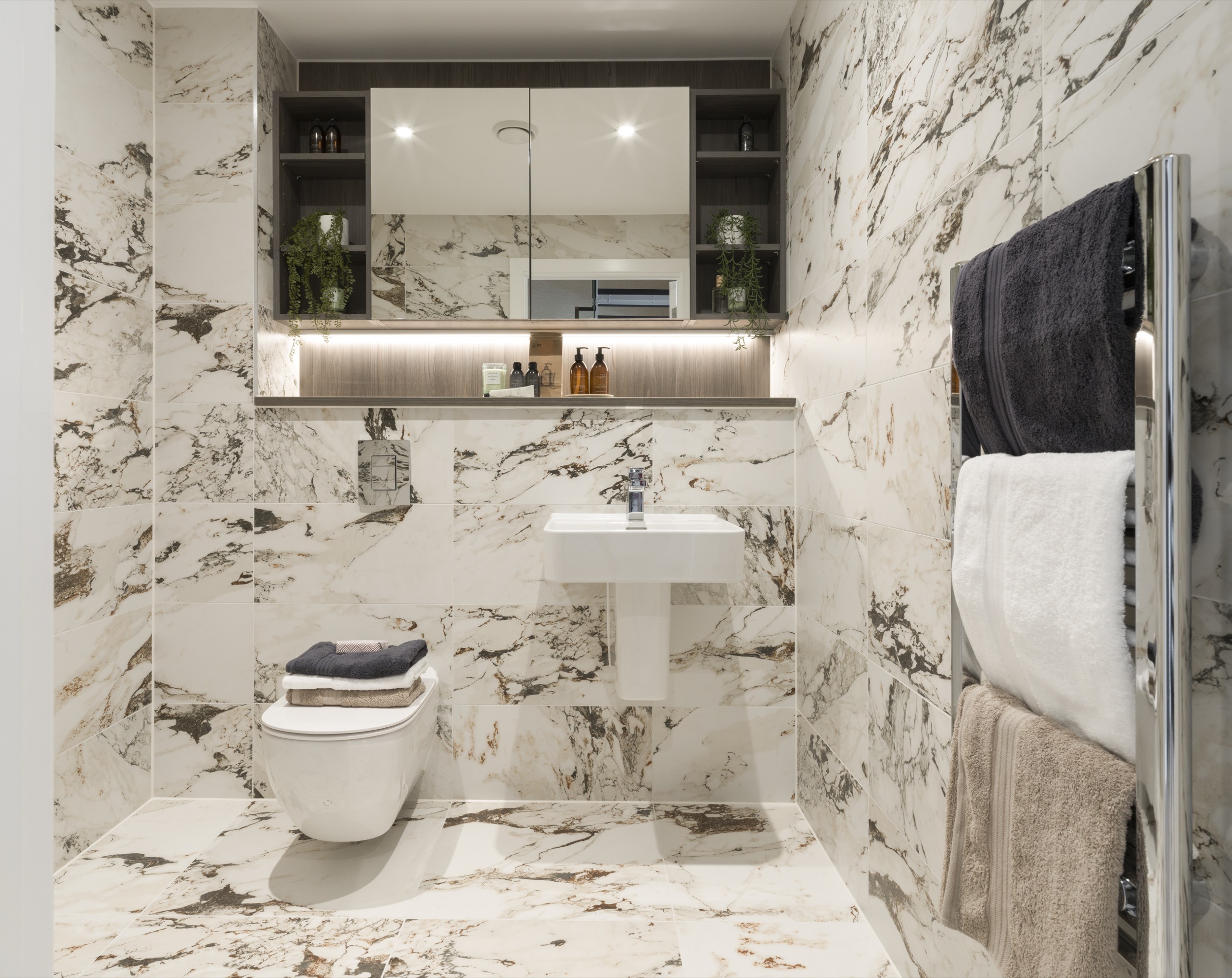 • Wall-mounted wash basin and WC with concealed cistern and soft close seat