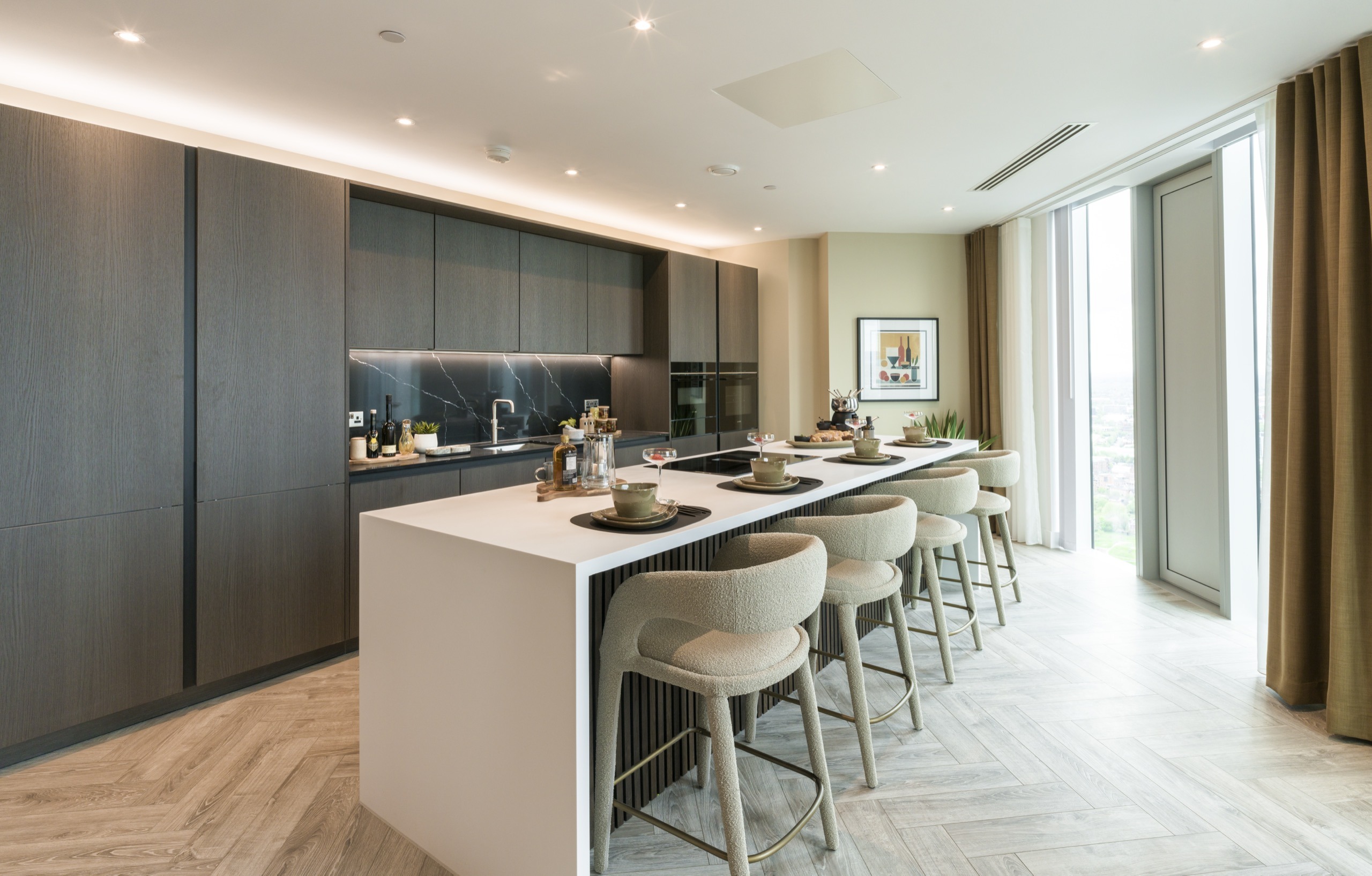 • Bespoke handleless kitchen cabinets with Oolong Oak tall, base and wall units