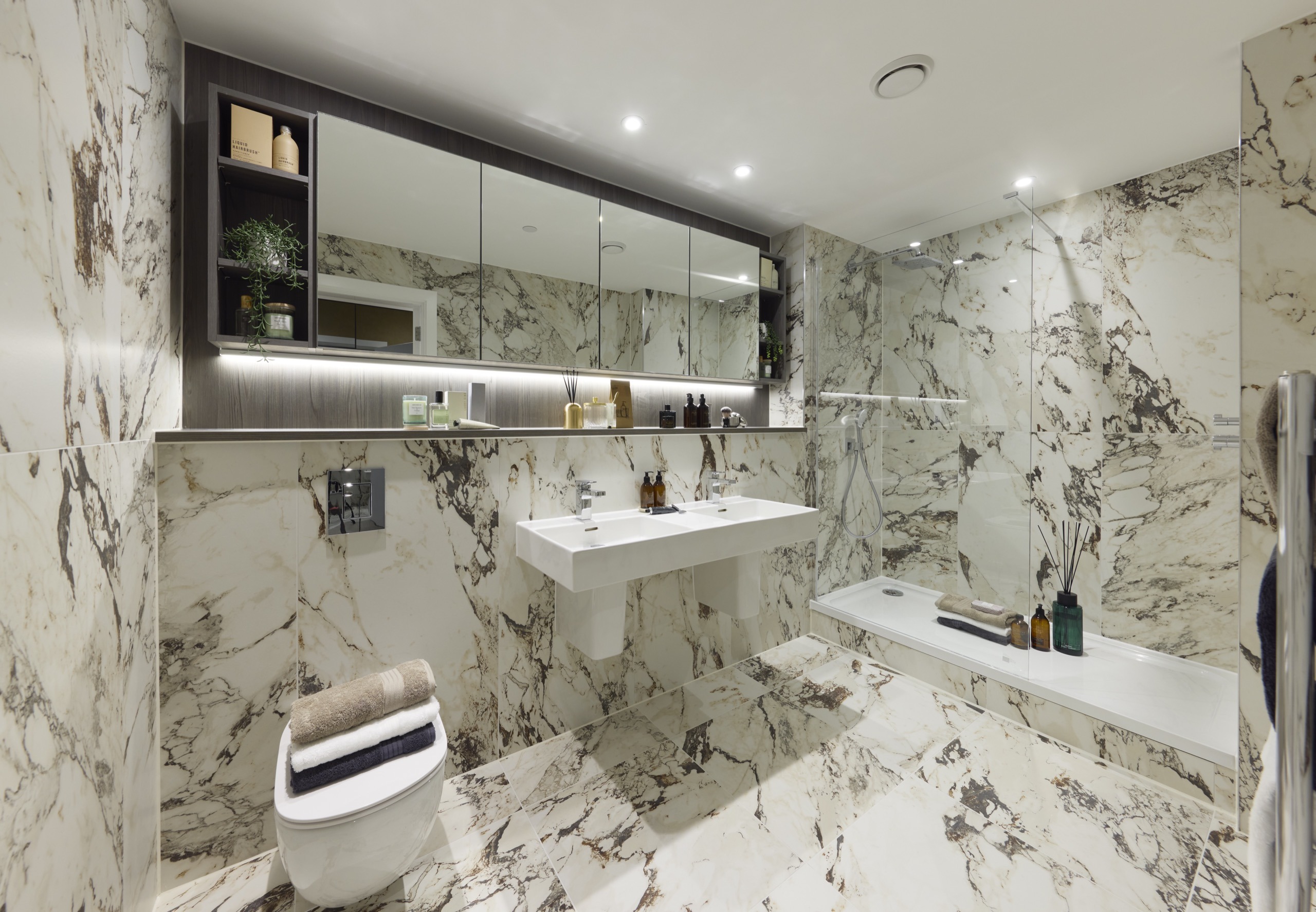 • Bespoke storage with mirrored doors and shelving, with built-in shaver socket and lighting