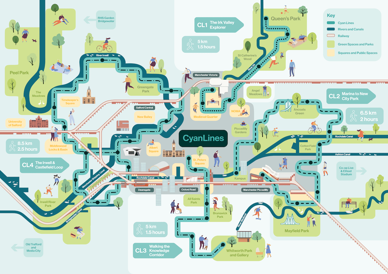 The first CyanLines routes already link together some of Manchester’s best-known spots – including Mayfield, New Islington Marina Park, Castlefield Viaduct, the Canal Basin, Symphony Park, Kampus and Ancoats Green – with lesser known pocket parks, canal towpaths, pedestrian walkways and future spaces such as the Science Museum courtyard, Central Retail Park, Victoria North, Holt Town and the Medieval Quarter.